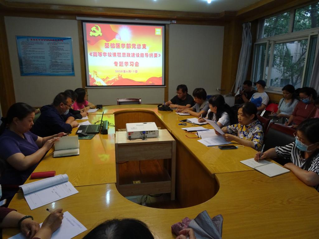 梁建君介绍了教育部印发《高等学校课程思政建设指导纲要》的背景意义、目标要求和重点内容,围绕培养什么人、怎样培养人、为谁培养人这一根本问题,全面提高人才培养能力这一核心点,科学设计课程思政教学体系,着力解决专业教育与思政教育“两张皮”问题等进行了重点介绍。各科室主任讨论分享了学习《纲要》文件的心得体会,交流了抗“疫”期间线上教学课程思政建设方面的经验。