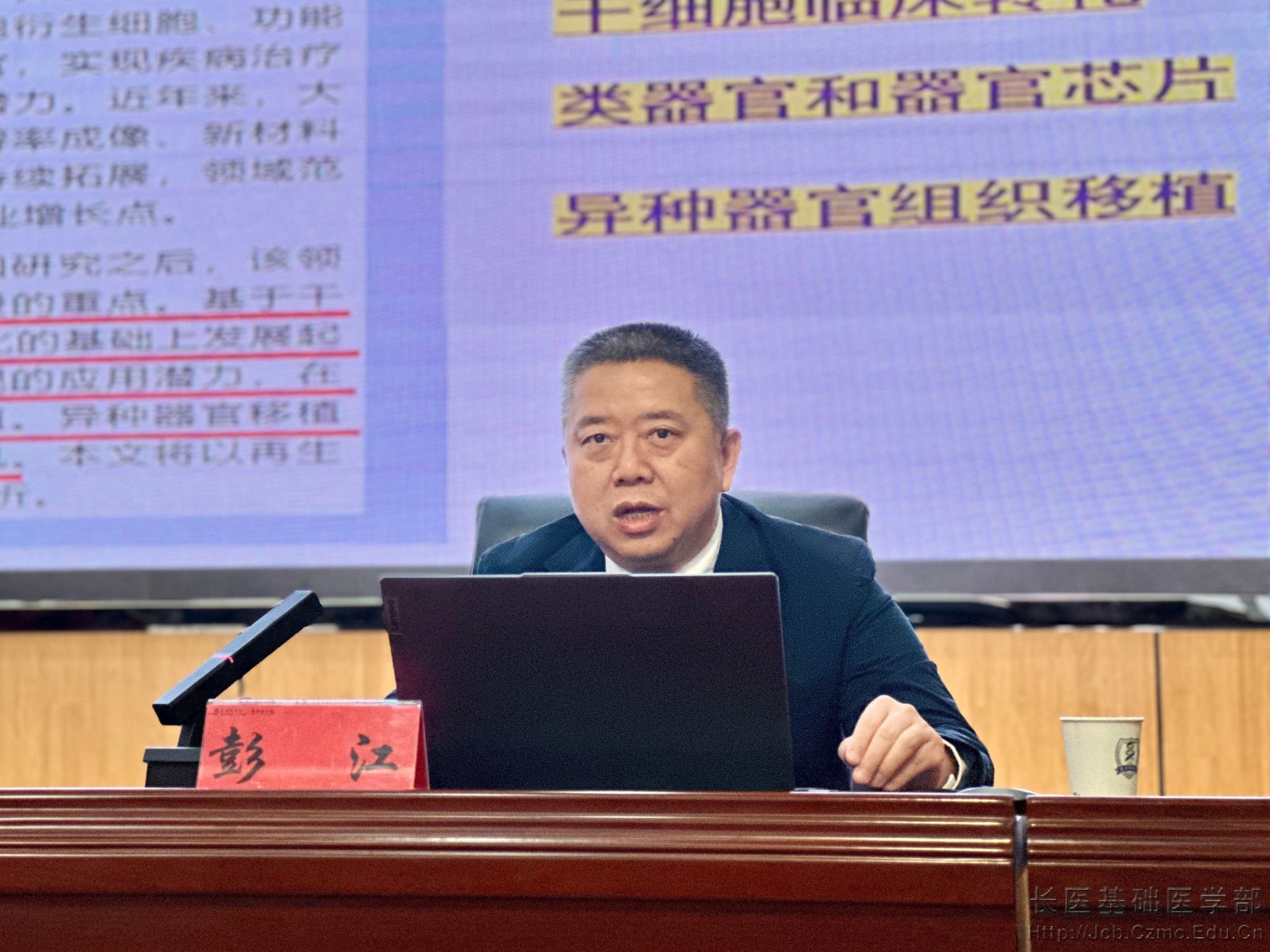 4 月 11 日,基础医学部在临床技能中心举办学术交流会,邀请中国人民解放军总医院骨科医学部研究所所长、全军骨科战创伤重点实验室主任、骨科再生医学北京市重点实验室主任彭江教授作学术讲座。基础医学部、药学院、人文艺术传媒系师生参加了会议。会议由基础医学部主任张毅强主持。