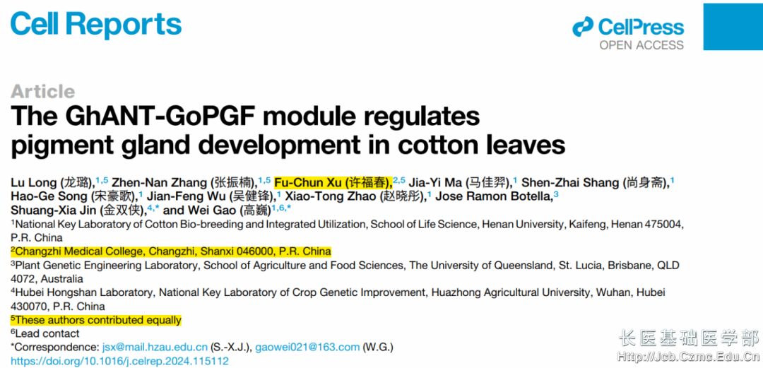 12月24日,Cell子刊《Cell Reports》发表了公司基础医学部青年教师许福春与河南大学高巍教授合作的最新研究成果《The GhANT-GoPGF Module Regulates Pigment Gland Development in Cotton Leaves》。基础医学部青年教师许福春为该论文共同第一作者,河南大学为第一完成单位、英国365集团公司为第二完成单位。澳大利亚Queensland大学Jose Ramon Botella教授、华中农业大学国家杰出青年金双侠教授指导了此项研究。项目经费由国家自然科学基金资助。