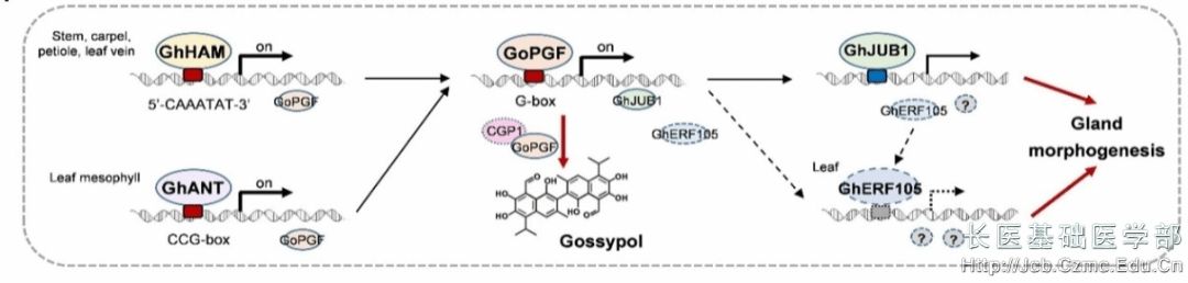 GhANT-GoPGF-GhJUB1模块在调控腺体形态发生和棉酚合成中的功能模型