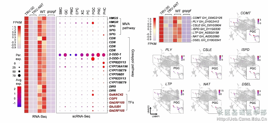 该研究整合了单杂测序(Y1H-seq)技术和单细胞测序(scRNA-seq)技术来筛选棉花腺体发育关键基因GoPGF的上游因子。通过表型研究(VIGS、CRISPR/Cas9和过表达)、表达模式分析(RNA原位杂交、RNA-seq、scRNA-seq、qRT-PCR)和启动子结合实验(Y1H、EMSA、LUC)发现AP2转录因子GhANT可结合到GoPGF启动子的2个CCG-box上,调节棉花叶片特异腺体的形成。本研究揭示了组织特异性分泌腔发育的精细调控,并提出了调控棉花色素腺体形态发生的转录模型(GhANT-GoPGF-GhJUB1)。此外,该发现GhANT-GoPGF模块控制了棉酚、褪黑素、黄嘌呤等多种腺体细胞的次生代谢途径,从而将研究方向扩展到棉花腺体的多功能性。
