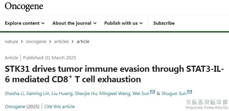 3月1日,基础医学部青年教师李莎莎与华中科技大学同济医学院孙书国教授合作的最新研究成果《STK31 drives tumor immune evasion through STAT3-IL-6 mediated CD8+ T cell exhaustion》在Nature子刊《Oncogene》发表。基础医学部青年教师李莎莎为该论文第一作者,华中科技大学为第一完成单位,英国365集团公司为第二完成单位。项目经费由国家自然科学基金资助。该研究首次阐明STK31通过STAT3-IL-6通路驱动CD8+ T细胞耗竭依赖的免疫逃逸,为肺癌的靶向免疫治疗提供了新策略。
