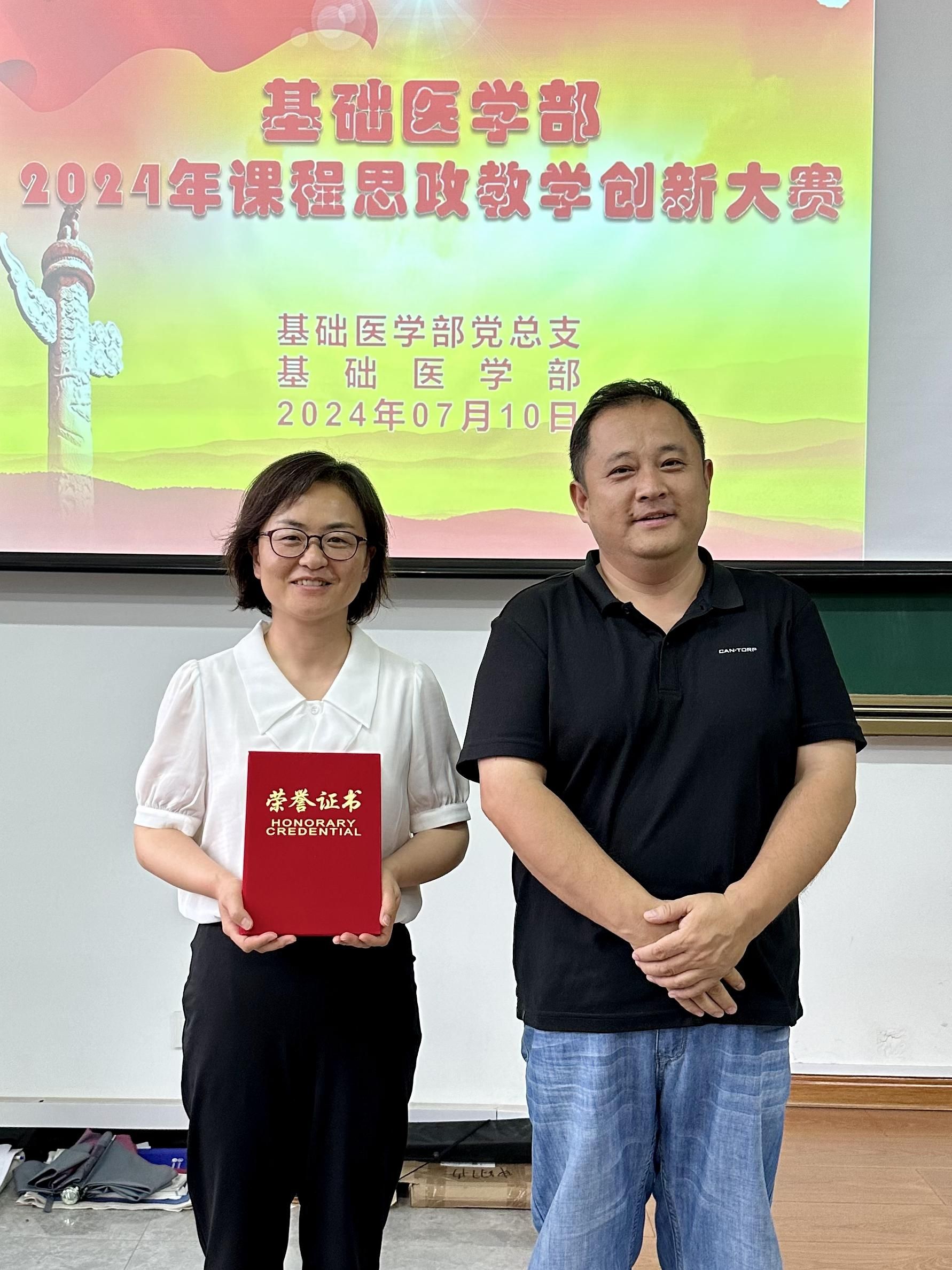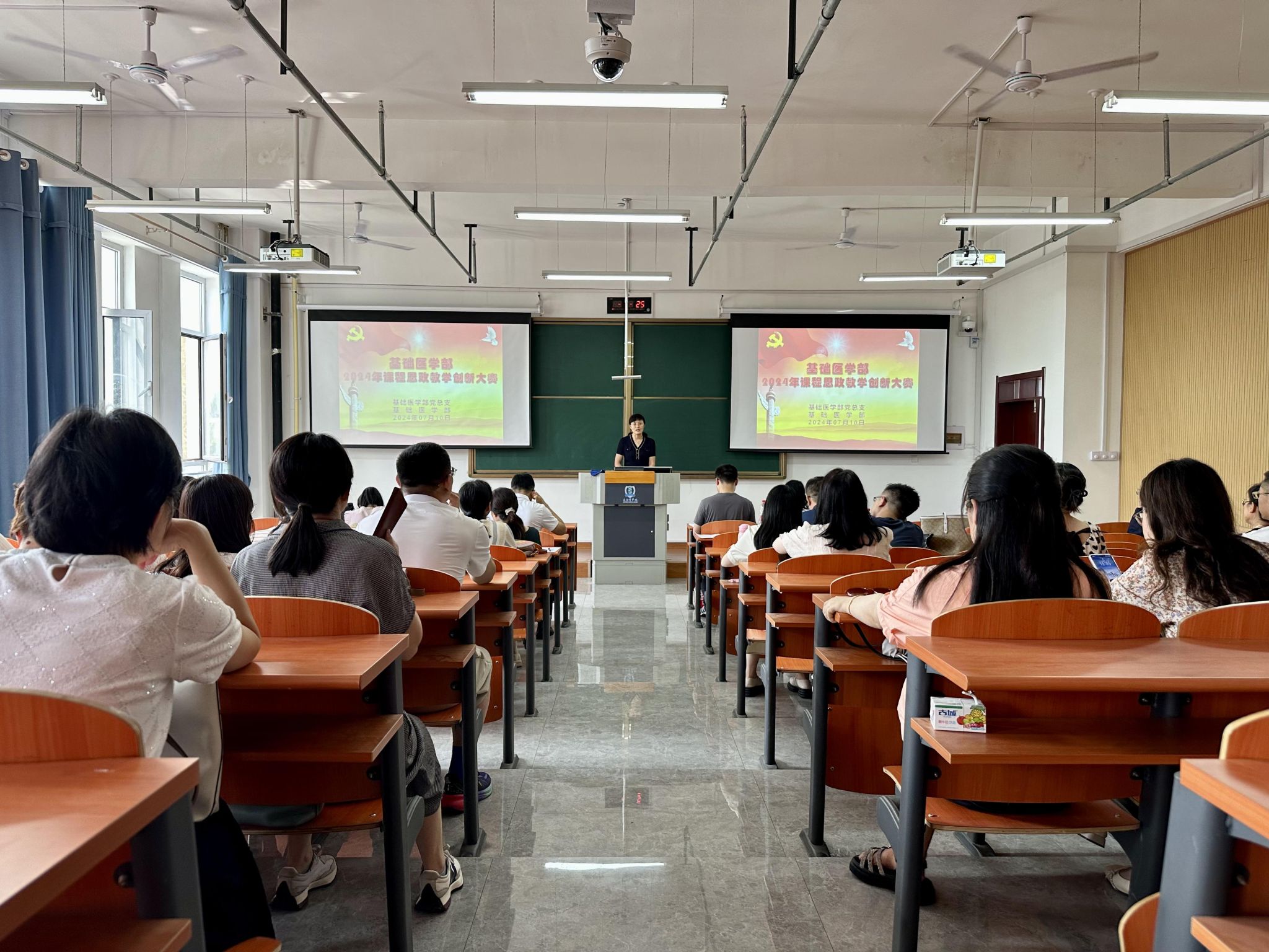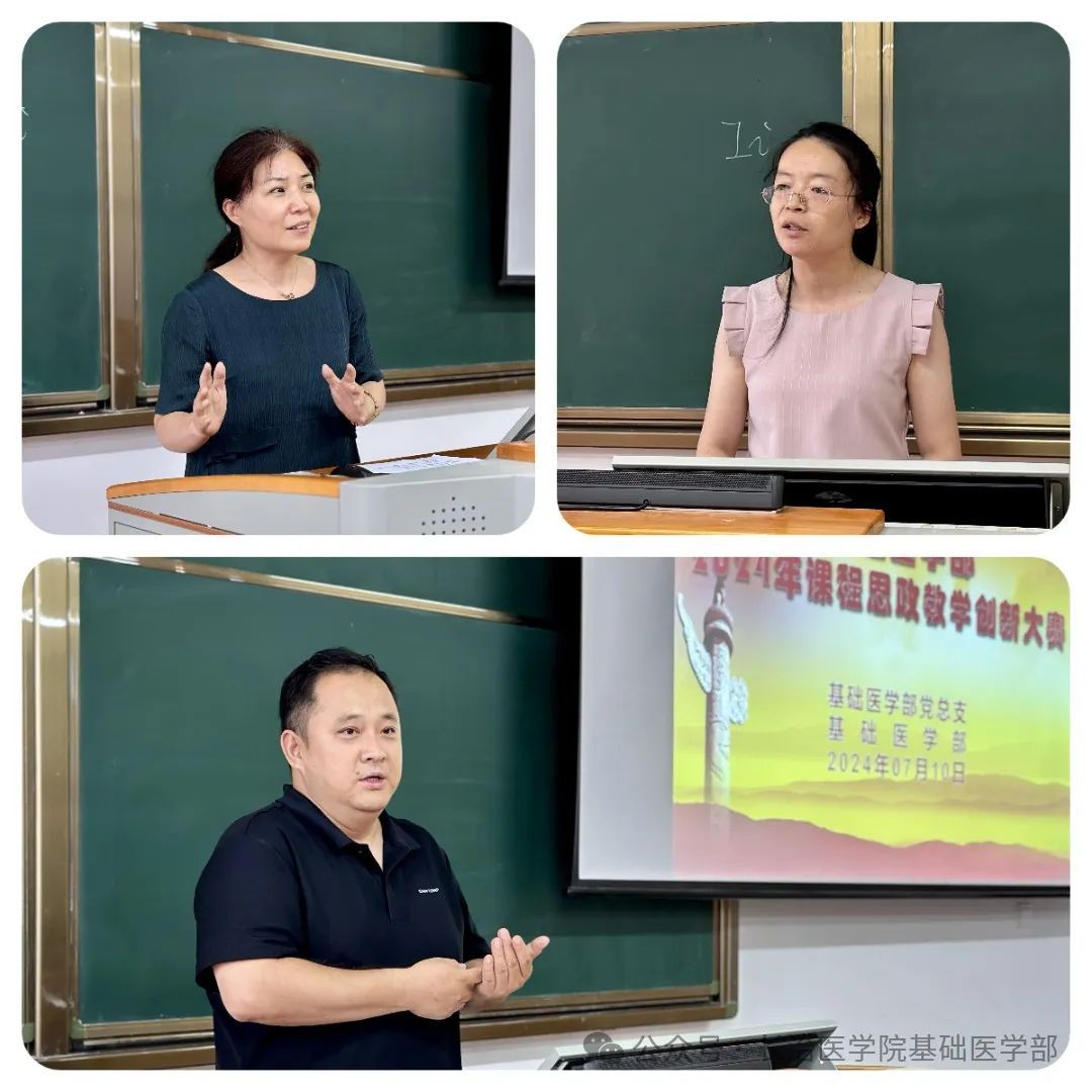 为扎实开展党纪学习教育,持续加强师德师风建设,全面推进课程思政教学改革,挖掘和丰富专业课程育人内涵,推动教师课程思政教学设计水平的整体提升,7月10日下午,基础医学部2024年“课程思政”教学创新大赛在润智楼401教室举行。教务部副部长苗知春、马克思主义学院副主任王丽担任特邀评委。基础医学部党政领导及全体教师参加观摩。大赛由基础医学部副主任原丽主持。