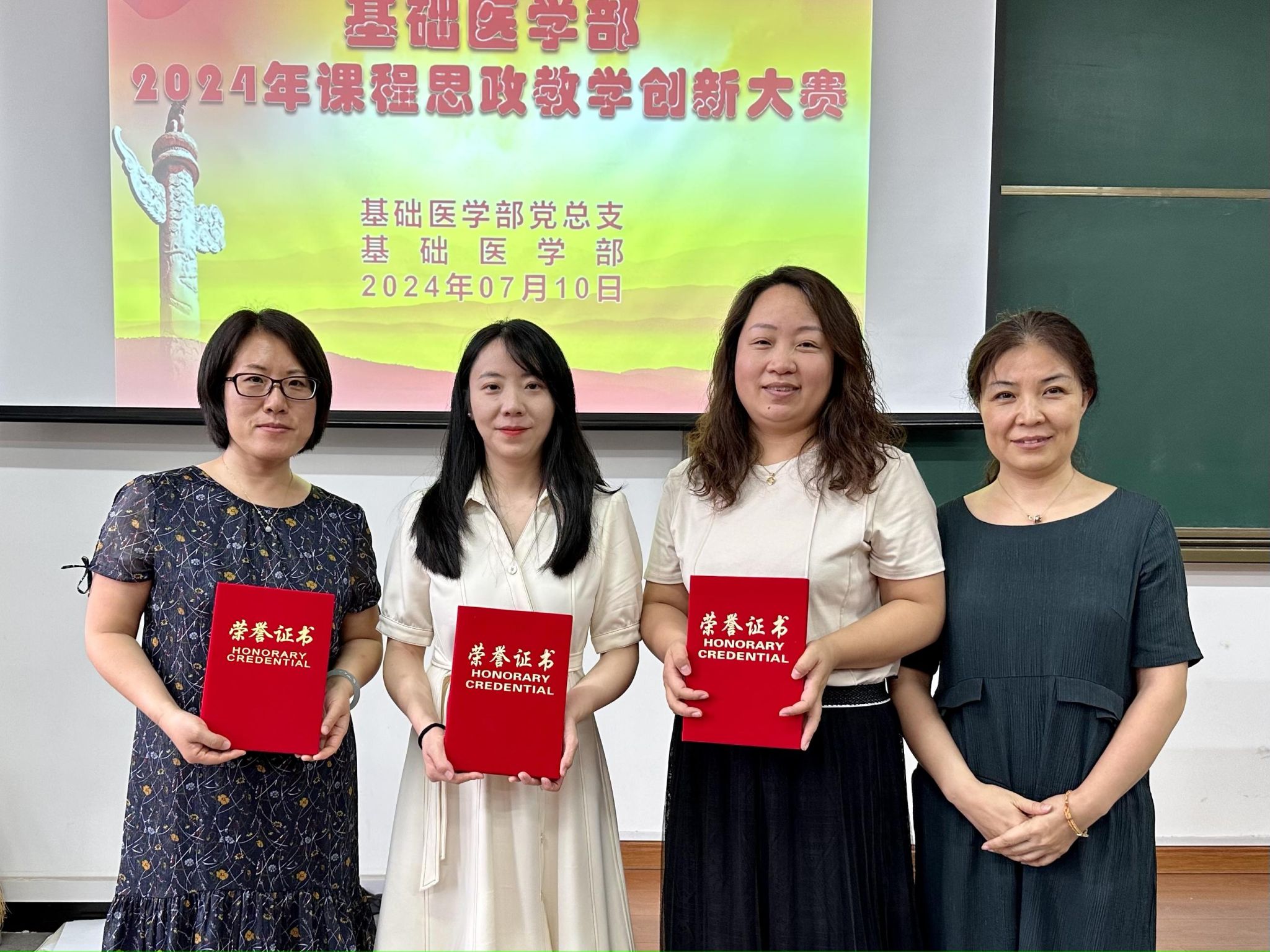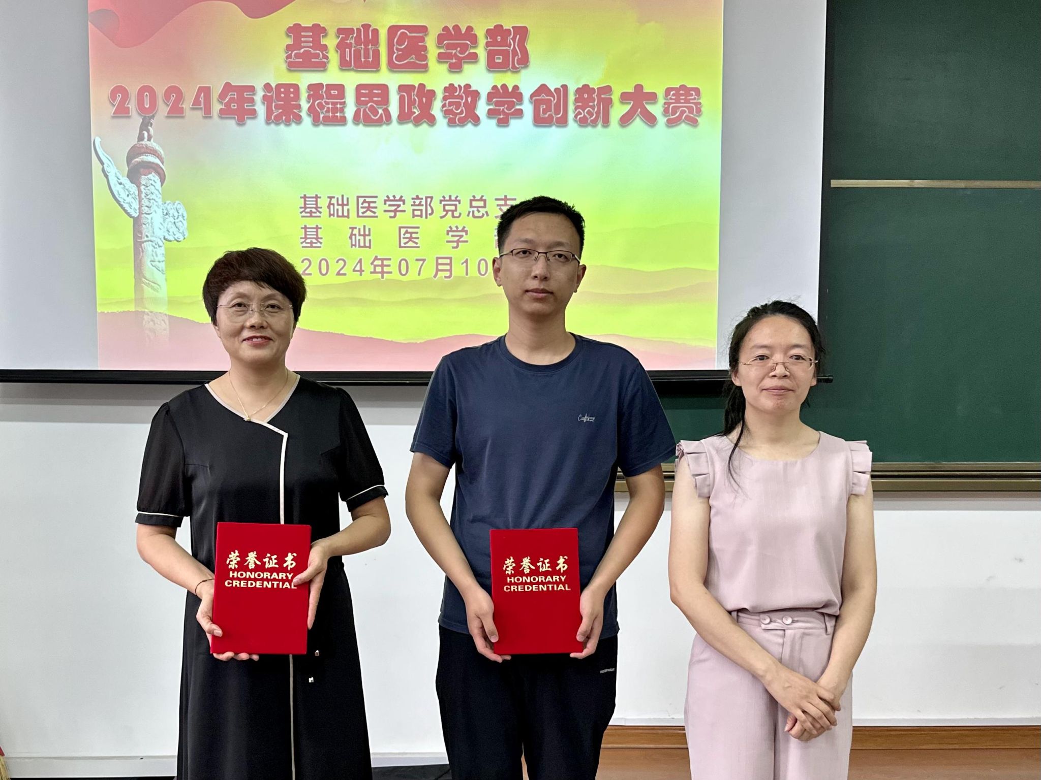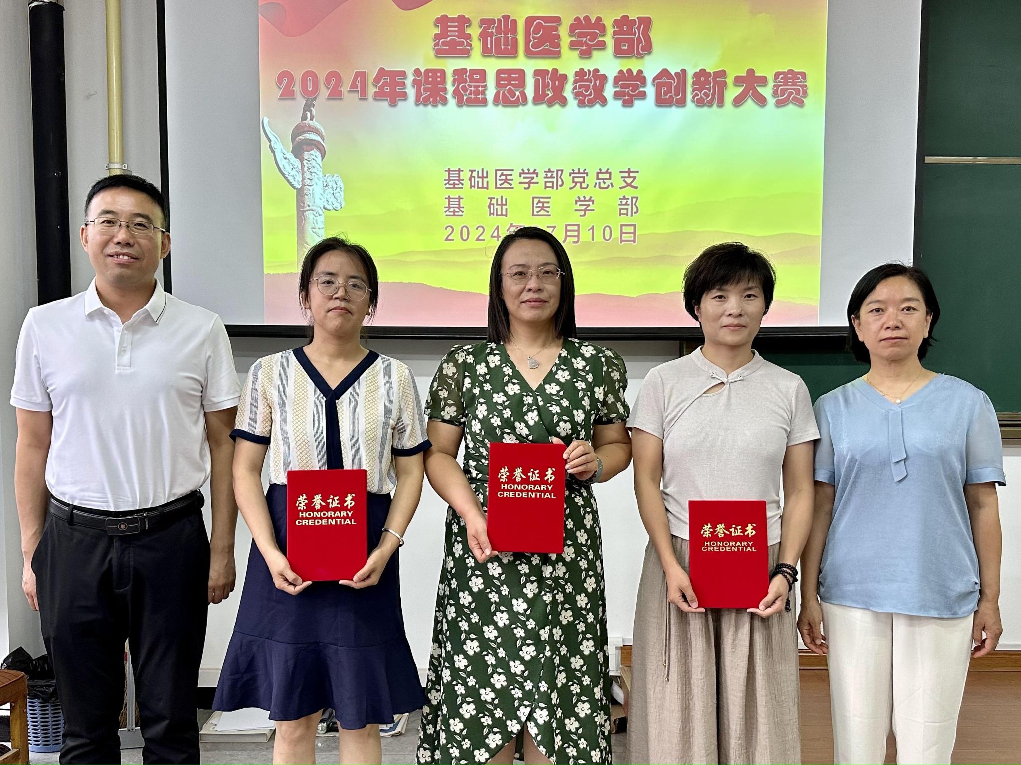 为扎实开展党纪学习教育,持续加强师德师风建设,全面推进课程思政教学改革,挖掘和丰富专业课程育人内涵,推动教师课程思政教学设计水平的整体提升,7月10日下午,基础医学部2024年“课程思政”教学创新大赛在润智楼401教室举行。教务部副部长苗知春、马克思主义学院副主任王丽担任特邀评委。基础医学部党政领导及全体教师参加观摩。大赛由基础医学部副主任原丽主持。