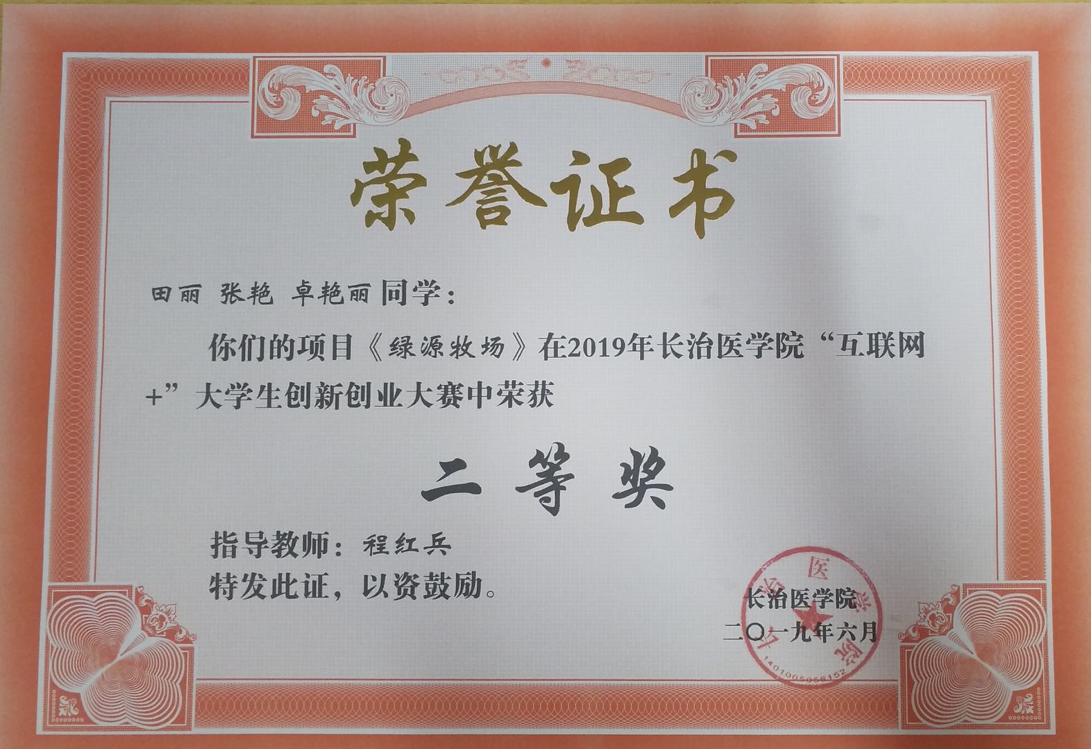 程红兵老师指导由田丽为负责人的项目“绿源牧场”,项目成员有:张艳、卓艳丽。